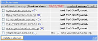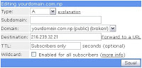 Step 5: Click on "Domains" and on the "Manage" beside your Domain name. You will notice the 6 subdomains with your domain out of which 5 are "Not Yet Configured." and 1 with the MX record. This is the place where we are now going to configure the Google Blogger A and CNAME Records. On this page you already got the naked domain "yourdomain.com.np" un-configured. So click on the unconfigured domain name. Now you are editing yourdomain.com.np which is A type. On destination type "216.239.32.21". Leave other field as it is and click on Save button.
