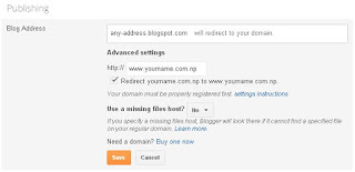 Step 9: Now you are about to complete the process. After clicking "+ Add a custom domain" message says if you want to buy a domain for your blog. Below that you can see "Already own a domain? Switch to advanced settings". Click on "Switch to advanced settings" . On the "Advanced setting" enter your registered .np domain like "www.yourname.com.np". Don't forget to prefix www before your domain name and Save the form.