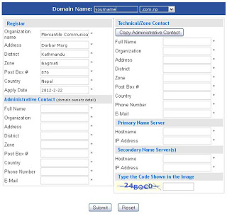 यो फारम तपाईले नछुटाई भर्नु पर्ने हुन्छ। तपाईलाई Primary Name Server र Secondary Name Server(s) को बारेमा सोधिऐको हुन्छ। यसमा तपाईले आफ्नो वेबहोस्ट को नेम सरभर प्रयोग गर्नु पर्ने हुन्छ जुन यस प्रकारको हुन्छ NS1.WEBHOST.COM (Primary) र NS2.WEBHOST.COM(Secondary)। त्यसमा लेखीऐको IP address को लागी Start Menu को Run मा CMD टाईप गर्नुहोस् र त्यो Command Prompt मा 'PING NS1.WEBHOST.COM' र 'PING NS2.WEBHOST.COM' टाईप गर्नुहोस्। तपाईले त्यसमा बिन्दुले छुटयाईऐको ऐउटा मान पाऊनु हुनेछ जुन यस प्रकारको हुने छ 234.785.34.34 र यसलाई नै IP address भनिन्छ्।